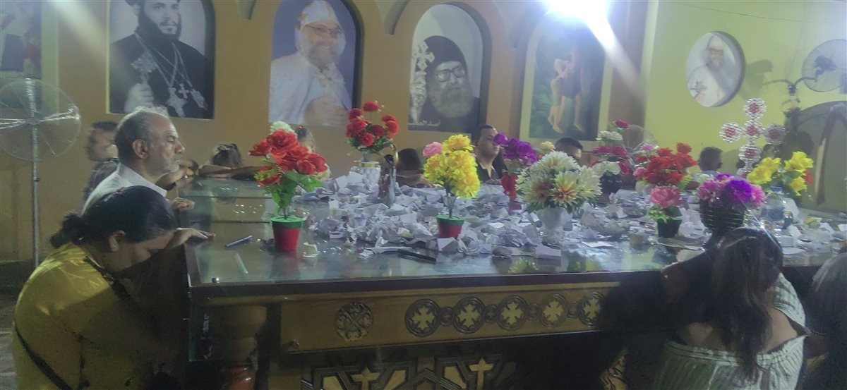 أوراق متناثرة وجبهات منحنية ومناجاة روحية وأمنيات تروي لكن دون أصوات.. وكل يمكث في ملكوته بعيدًا عن الزحام جسده مائل على الضريح وقلبه معلق مع السيدة العذراء يناجيها ويدعو الله لعلها ساعة استجابة لا فرق بين رجل وامرأة أو غني وفقير أو متعلم وجاهل الجميع سواسية في حضرة أم النور.