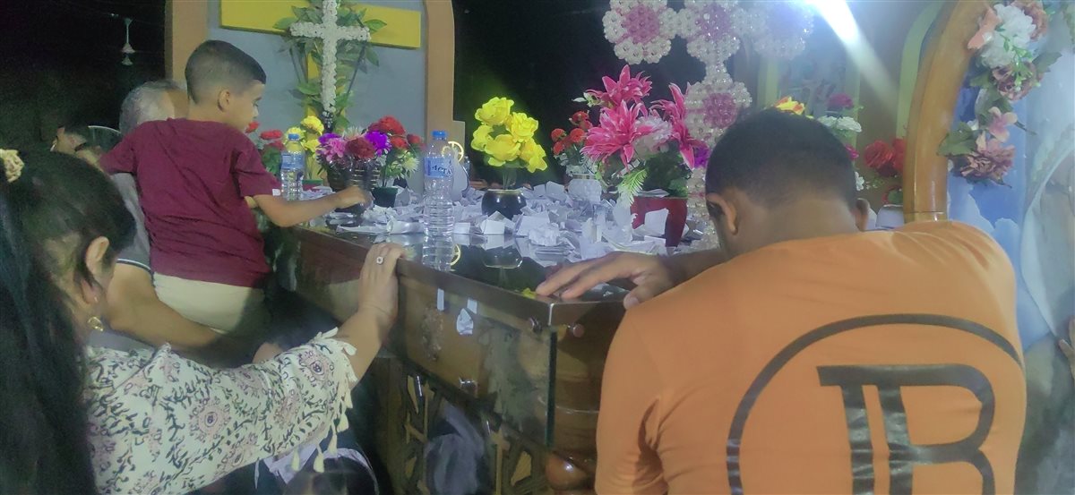 المشهد مهيب حيث تلتقي الجباة المنحنية للزوار ودموعهم المختلطة بالهموم وأمنياتهم المعلقة وأحلامهم المكتوبة على الورق والجميع صف واحد أمام رجاء العذراء ينتظر حدوث المعجزة فهي وإن كانت أوراق صغيرة لكنها تحمل أمنيات وأوجاع كبيرة.
