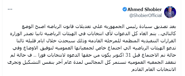 وقال شوبير عن قانون الرياضة: "بعد تصديق سيادة رئيس الجمهوريه علي تعديلات قانون الرياضة اصبح الوضع كالتالي.. يتم الغاء كل الدعوات لأي انتخابات في الهيئات الرياضيه..