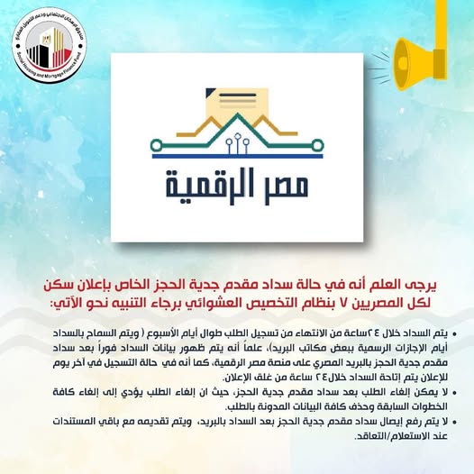 متاح يوميا للرد على كافة الأسئلة المتعلقة بخدمات الإسكان عبر منصة مصر الرقمية على مدار 24 ساعة.