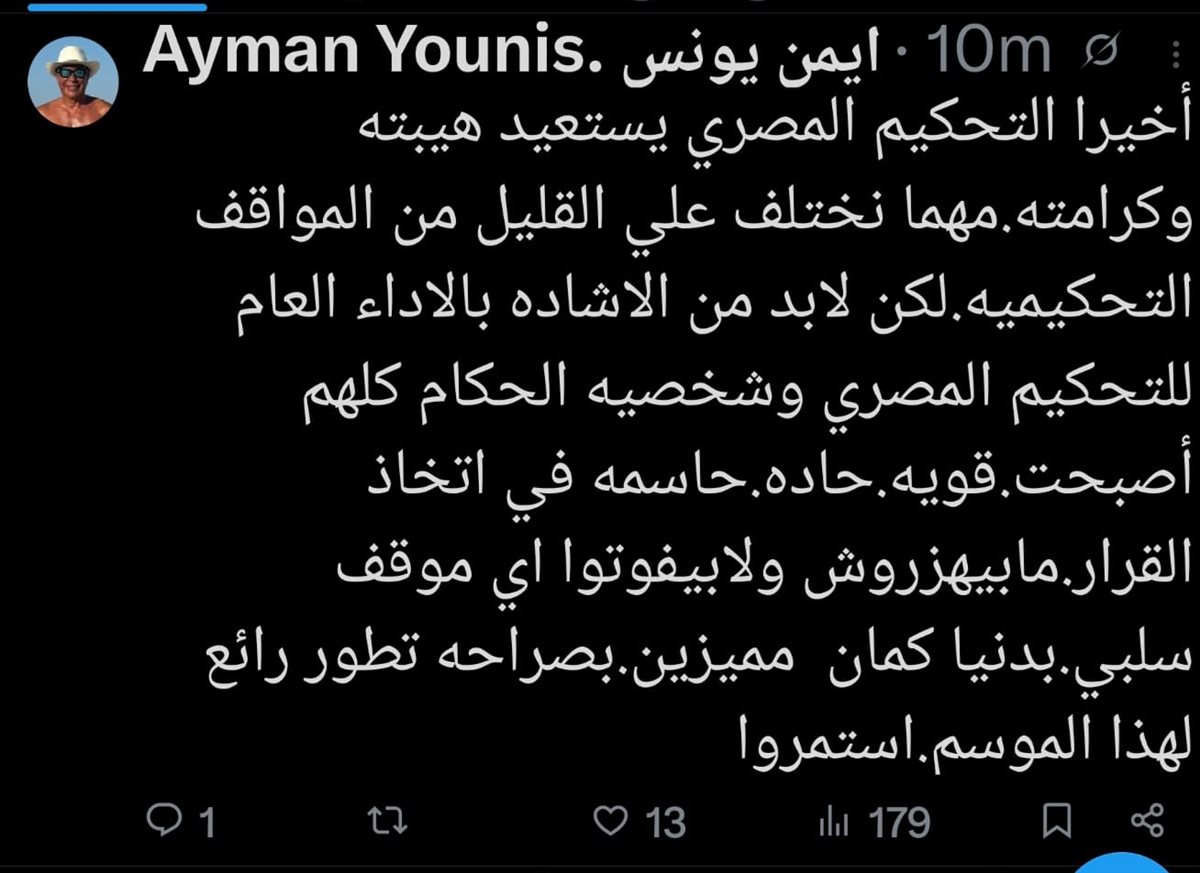 وأضاف نجم الزمالك السابق عبر صفحته الرسمية: “أخيرًا التحكيم المصري يستعيد هيبته وكرامته. مهما نختلف على القليل من المواقف التحكيمية، لكن لابد من الإشادة بالأداء العام للتحكيم المصري وشخصية الحكام كلهم أصبحت قوية، حادة، حاسمة في اتخاذ القرار، ما بيهزروش ولا يفوتوا أي موقف سلبي. بدنيا كمان مميزين. بصراحة تطور رائع لهذا الموسم. استمروا”.