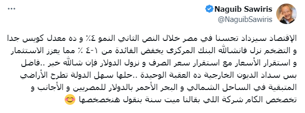 وقال المهندس نجيب ساويرس عن حالة الاقتصاد المصري في المرحلة المقبلة: "الاقتصاد سيزداد تحسنا في مصر خلال النصف الثاني. النمو ٤٪ وده معدل كويس جدًا، والتضخم نزل فإن شاء الله البنك المركزي يخفض الفائدة من ١-٤ ٪ مما يعزز الاستثمار واستقرار الأسعار مع استقرار سعر الصرف ونزول الدولار فإن شا الله خير. فاضل بس سداد الديون الخارجية ده العقبة الوحيدة.. حلها سهل الدولة تطرح الأراضي المتبقية في الساحل الشمالي والبحر الأحمر بالدولار للمصريين والأجانب وتخصخص الكام شركة اللي بقالنا ميت سنة بنقول هنخصخصها".