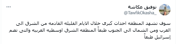وقال توفيق عكاشة، في رسالته الغامضة عن أحداث منطقة الشرق الأوسط: "سوف تشهد المنطقة أحداثا كبرى خلال الأيام القليلة القادمة من الشرق إلى الغرب ومن الشمال الى الجنوب، طبعًا المنطقة الشرق أوسطية العربية والتى تضم إسرائيل طبعًا".