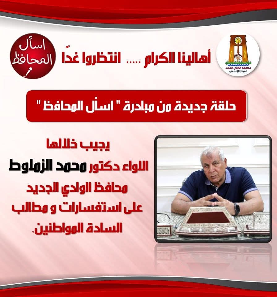 أعلن اللواء دكتور محمد الزملوط، محافظ الوادي الجديد، اليوم السبت، استئناف حلقات مبادرة اسأل المحافظ بانتظام شهريًّا بعد فترة انشغال بافتتاح المجمع الحكومي للخدمات الذكية وتجهيزاته، مؤكّدًا استمرار التواصل مع المواطنين عبر الهاتف والصفحات الرسمية لتلقي الشكاوى والمطالب والعمل على حلّها.