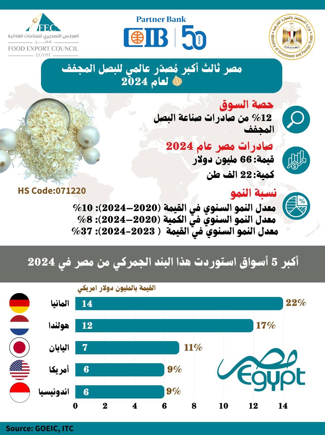 وتُشكّل هذه الأسواق الخمسة حوالي 69% من إجمالي صادرات مصر من البصل المجفف، ما يعكس الثقة المتزايدة في جودة وتنافسية المنتج المصري، وهذا الأداء المتميز يُبرز تنافسية مصر عالميًا في قطاع المنتجات الزراعية المُعالجة، ويفتح آفاقًا جديدة للتوسع في أسواق دولية واعدة.