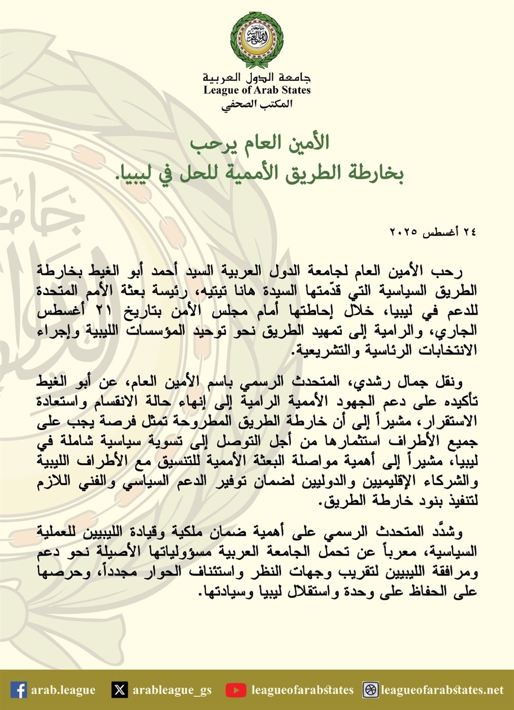 ونقل جمال رشدي، المتحدث الرسمي باسم الأمين العام، عن أبو الغيط تأكيده دعم الجهود الأممية الرامية إلى إنهاء حالة الانقسام واستعادة الاستقرار، مشيرًا إلى أن خارطة الطريق المطروحة تمثل فرصة يجب على جميع الأطراف استثمارها من أجل التوصل إلى تسوية سياسية شاملة في ليبيا، مشيرًا إلى أهمية مواصلة البعثة الأممية للتنسيق مع الأطراف الليبية والشركاء الإقليميين والدوليين لضمان توفير الدعم السياسي والفني اللازم لتنفيذ بنود خارطة الطريق.