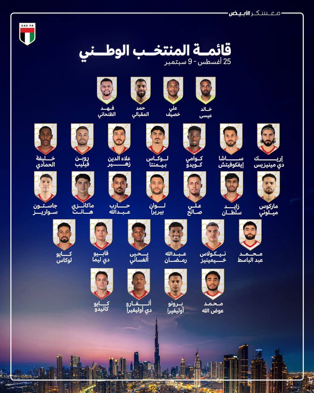 أعلن الاتحاد الإماراتي لكرة القدم، قائمة المنتخب الأول للمعسكر الداخلي في دبي، بداية من اليوم الإثنين، وحتى 9 سبتمبر، استعدادًا لملحق التصفيات الآسيوي المؤهل لـ مونديال 2026.