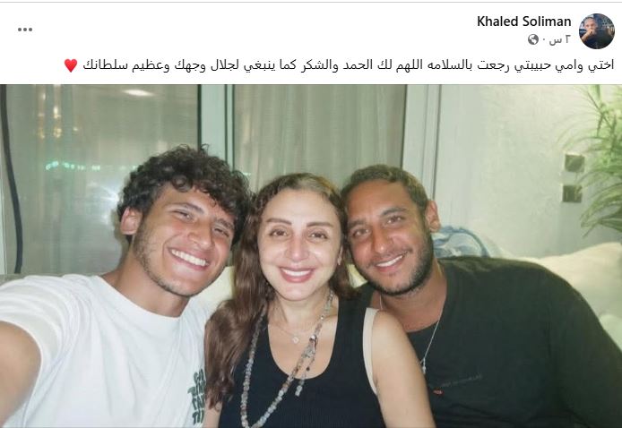 ونشر “سليمان” صورة لها عبر حسابه الرسمي على "فيسبوك"، وقال: أختي وأمي حبيبتي رجعت بالسلامة، اللهم لك الحمد والشكر كما ينبغي لجلال وجهك وعظيم سلطانك".