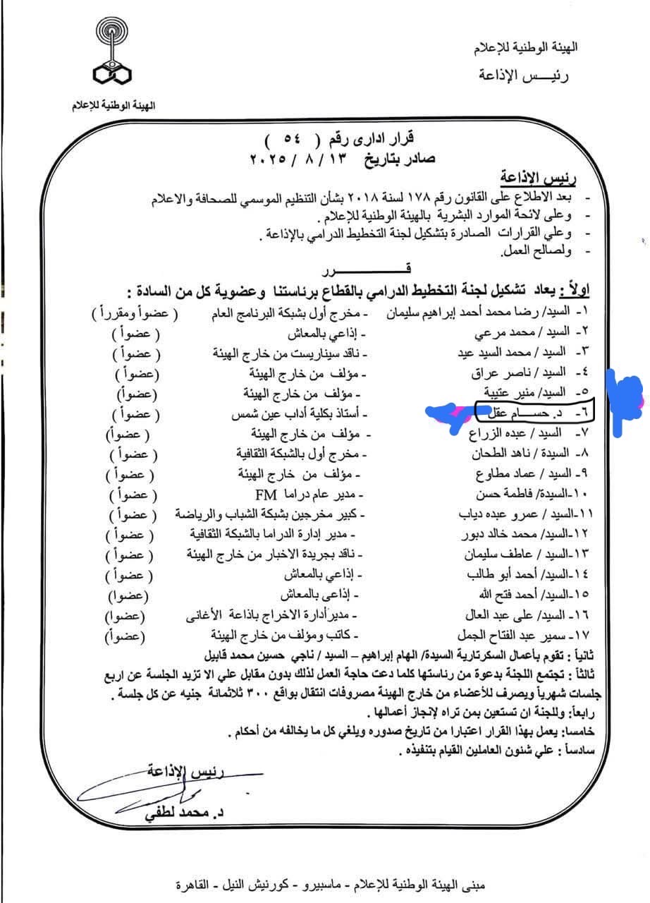 فيتو تنفرد بنشر قرار رئيس الإذاعة بتعيين حسام عقل في لجنة الدراما