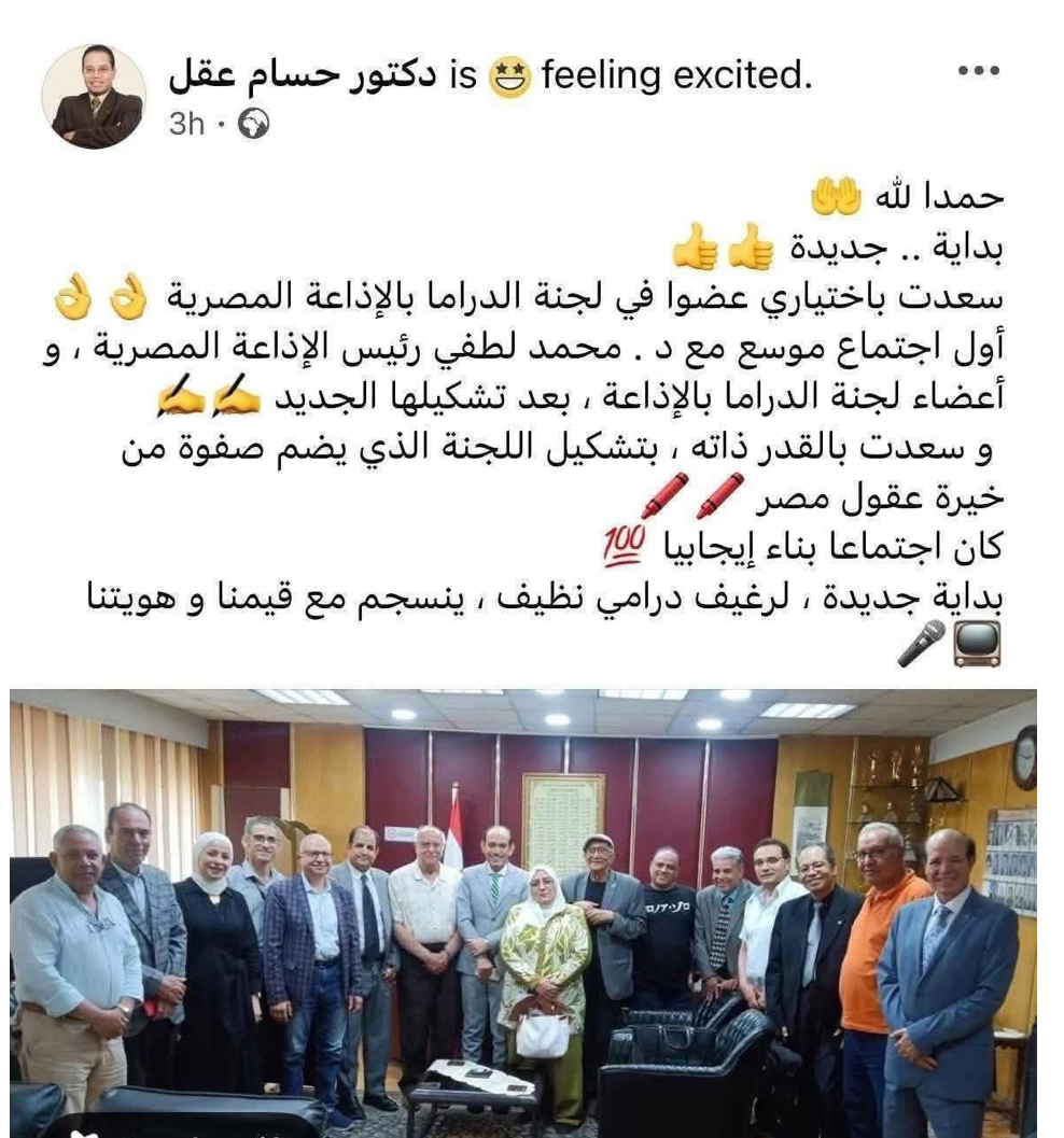 الغاضبون من الاستعانة بخدمات “عقل” في لجنة الدراما بالإذاعة سلطوا الضوء على منشور للأخير يعلن فيه تكليفه بعضوية اللجنة، وأرفقه بصورة جماعية للأعضاء برفقة رئيس الإذاعة نفسه.