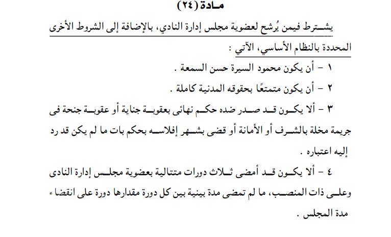 وحددت اللائحة شروط الترشح لمجالس إدارات الأندية في المادة 24، والتي جاءت كالتالي: