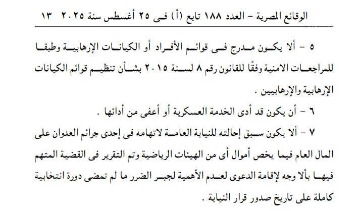 7- ألا يكون سبق إحالته للنيابة العامة لاتهامه في إحدى جرائم العدوان على المال العام فيما يخص أموال أي من الهيئات الرياضية وتم التقرير في القضية المتهم فيها بألا وجه لإقامة الدعوى لعدم الأهمية لجبر الضرر ما لم تمضي دورة انتخابية كاملة على على تاريخ صدور قرار النيابة.