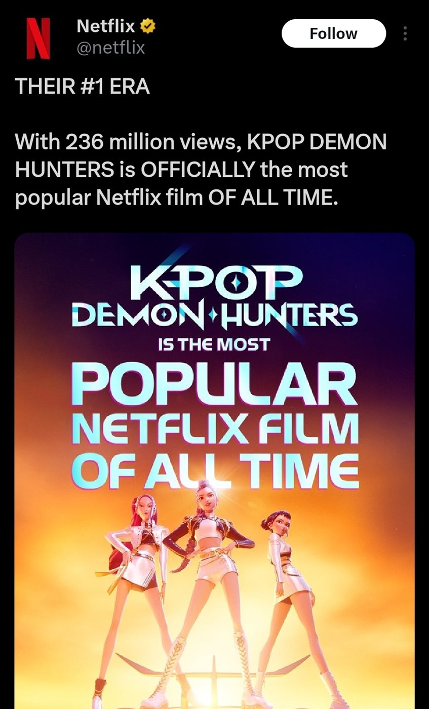 نجح الفيلم العالمي "صائدو شياطين الكيبوب" (KPop Demon Hunters) في تحقيق إنجاز تاريخي على منصة نتفليكس.
