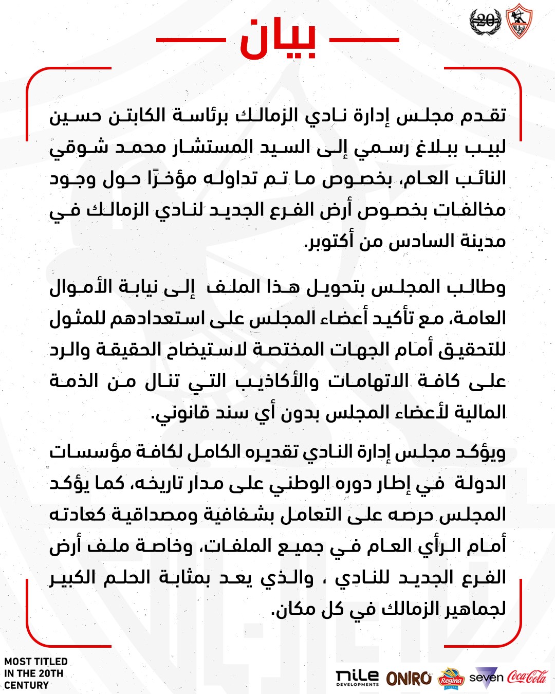 أصدر مجلس إدارة نادي الزمالك برئاسة الكابتن حسين لبيب بيانًا رسميًا أعلن فيه عن تقدمه ببلاغ إلى المستشار محمد شوقي، النائب العام، بشأن ما أثير مؤخرًا حول وجود مخالفات تتعلق بأرض فرع النادي الجديد بمدينة السادس من أكتوبر.