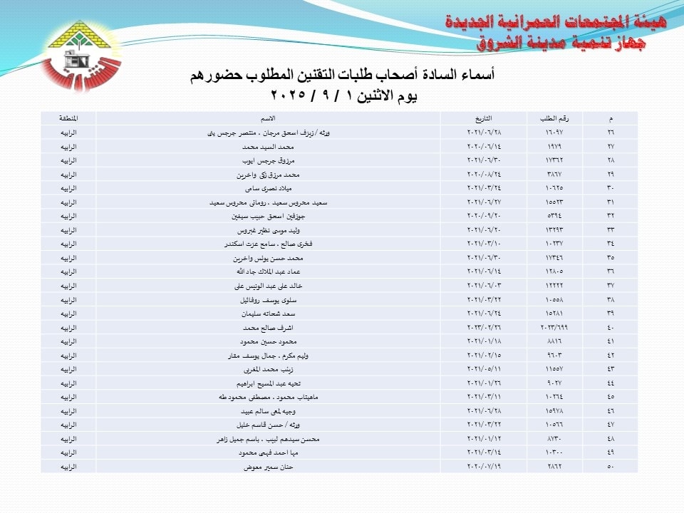 أعلنت هيئة المجتمعات العمرانية بوزارة الإسكان أسماء دفعة جديدة من أصحاب طلبات تقنين أراضيهم بتوسعات مدينة الشروق، وذلك للحضور إلى مقر جهاز المدينة لاستكمال إجراءات التقنين، وذلك بداية من يوم الأحد 31 أغسطس.