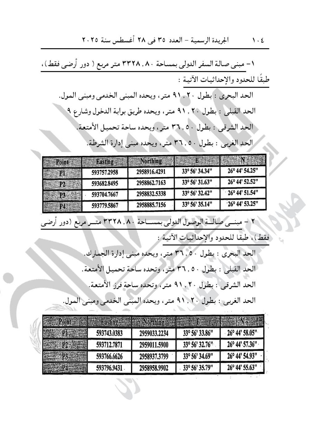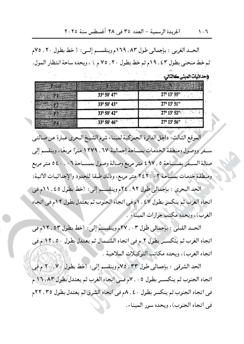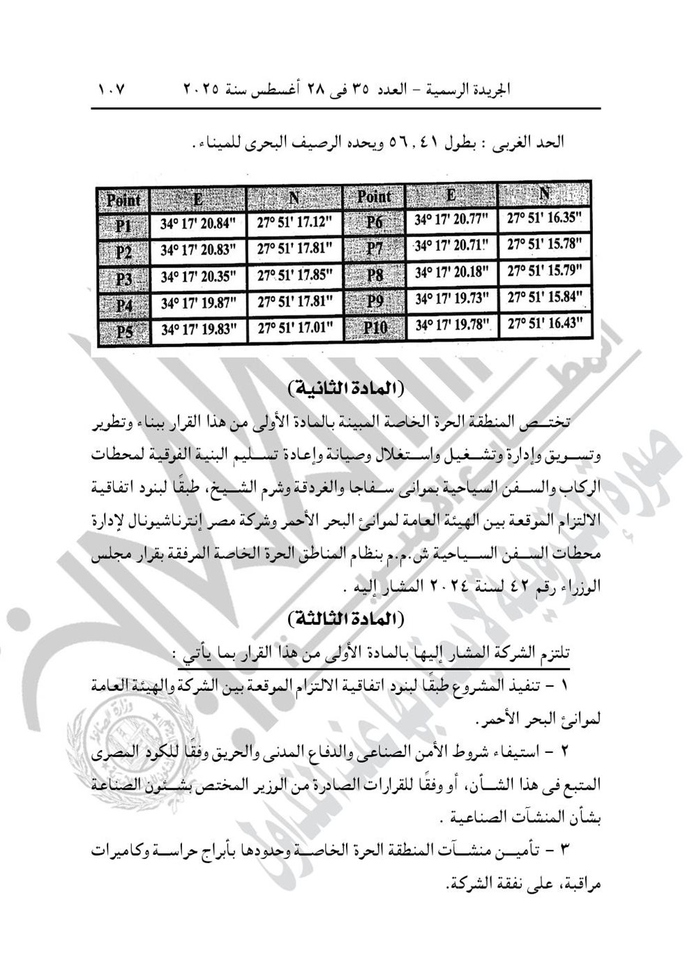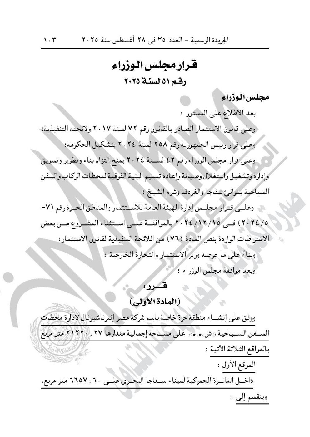 -قـرار مجلس الوزراء رقم 51 لسنة 2025، بشأن الموافقة على إنشاء منطقة حرة خاصة باسم شركة مصر إنترناشيونال لإدارة محطات السفن السياحية "ش.م.م"، على مساحة إجمالية مقدارها 21220.27 متر مربع بالمواقع الثالثة الآتية: