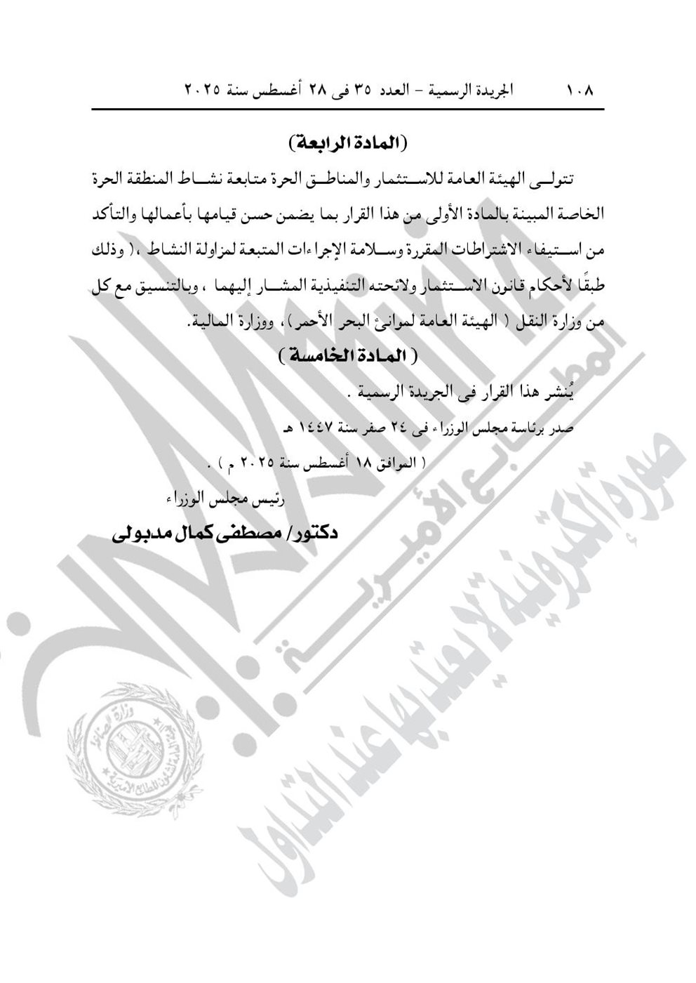 نشرت الجريدة الرسمية في عددها رقم 35، الصادر في 28 أغسطس 2025، 3 قرارات جديدة اليوم لرئيس الوزراء الدكتور مصطفى مدبولي، بشأن إنشاء منطقة حرة بسفاجا والغردقة وشرم الشيخ والموافقة على إسقاط جنسية مصري، وتخصيص أرض من أملاك الدولة الخاصة لصالح جهاز مستقبل مصر للتنمية المستدامة.