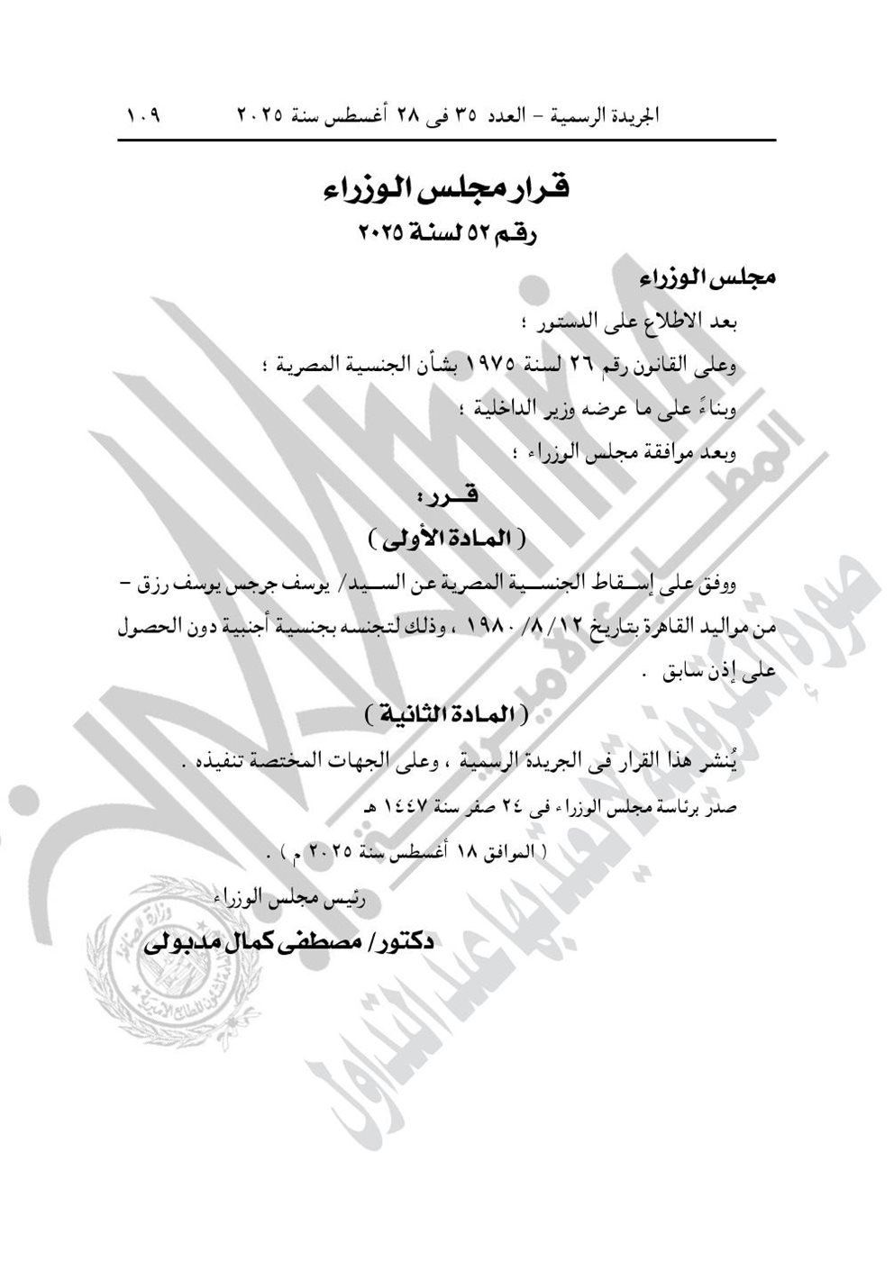 -قرار مجلس الوزراء رقم 52 لسنة 2025، بالموافقة على إسقاط الجنسية المصرية عن يوسف جرجس يوسف رزق، من مواليد القاهرة 1980، وذلك لتجنسه بجنسية أجنبية دون الحصول على إذن سابق.