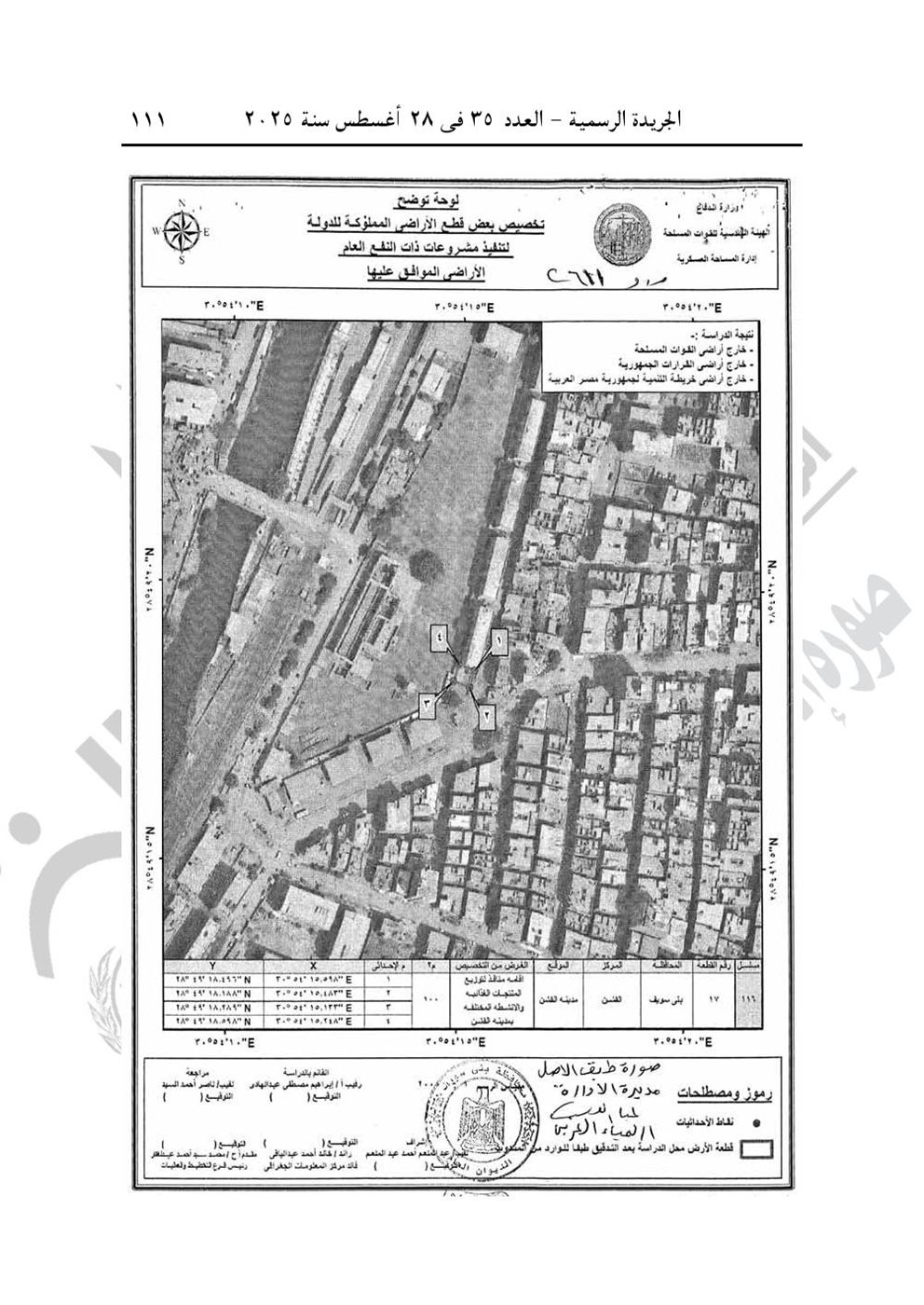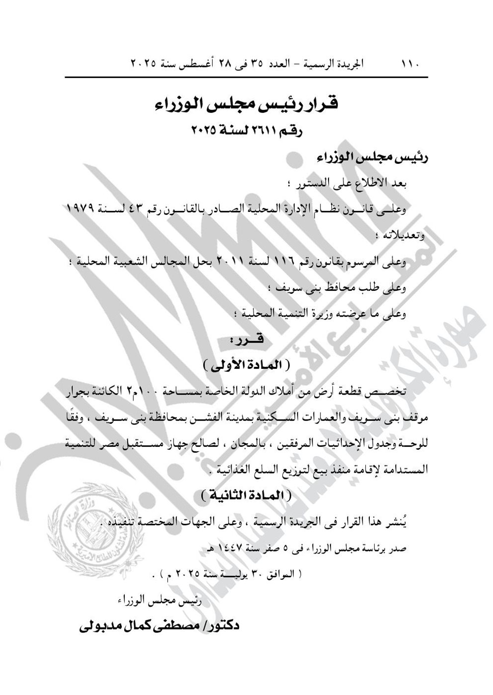 -قرار رئيس مجلس الوزراء رقم 2611 لسنة 2025، تخصيص قطعة أرض من أملاك الدولة الخاصة بمساحة 100 متر مربع، الكائنة بجوار موقف بنى سويف والعمارات السكنية بمدينة الفشن بمحافظة بنى سويف، بالمجان، لصالح جهاز مستقبل مصر للتنمية المستدامة لإقامة منفذ بيع لتوزيع السلع الغذائية.