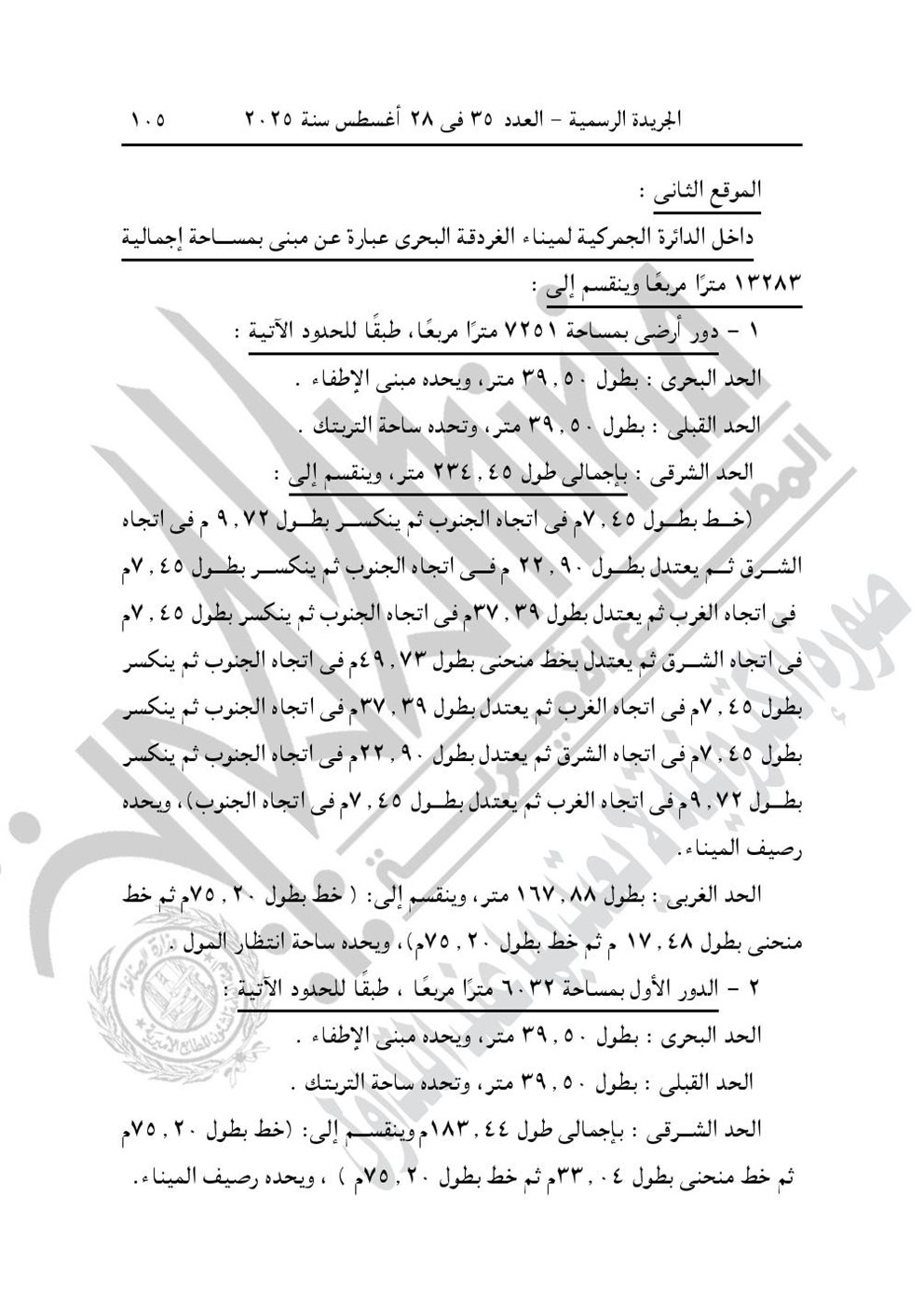 الموقع الثانى: داخل الدائرة الجمركية لميناء الغردقة البحرى عبارة عن مبنى بمساحة إجمالية 13283 مترًا مربعًا.