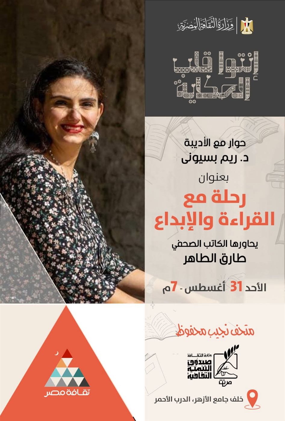 يستضيف متحف ومركز إبداع نجيب محفوظ بتكية محمد بك أبو الدهب، التابع لـقطاع صندوق التنمية الثقافية، الروائية والدكتورة ريم بسيوني في حوار مفتوح يتناول مسيرتها الأدبية.