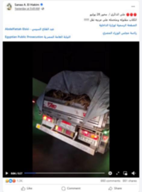 تمكنت الأجهزة الأمنية بوزارة الداخلية ، من كشف حقيقة مقطع فيديو تم تداوله عبر مواقع التواصل الاجتماعي، زُعم خلاله قيام قائد سيارة ربع نقل بنقل كلاب نافقة بصندوق السيارة أثناء سيره بمحور 26 يوليو بمحافظة الجيزة.