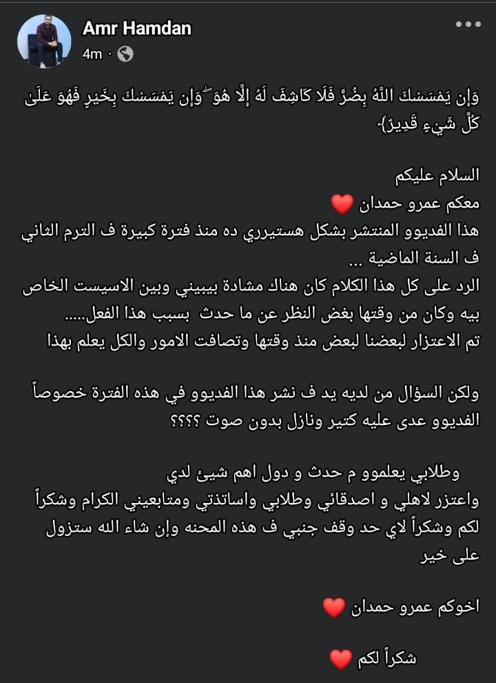 وقال المدرس في منشور على صفحته الشخصية بـ"فيس بوك"، إن الفيديو المنتشر كان منذ فترة تعود للتيرم الثاني من العام الماضي.