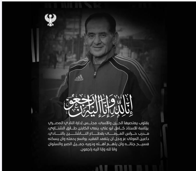 توفي في ساعة مبكرة من صباح اليوم السبت، طارق الشناوي مدرب قطاع الناشئين بالنادي المصري.