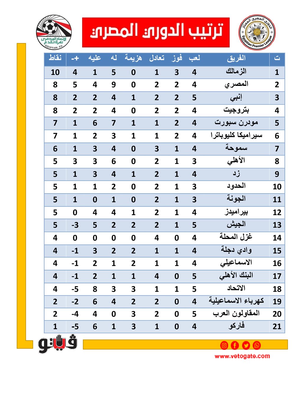 ترتيب الدوري المصري، يتصدر الزمالك جدول ترتيب الدوري المصري قبل مباراة الأهلي ضد بيراميدز في الجولة الخامسة المقرر إقامتها اليوم السبت.