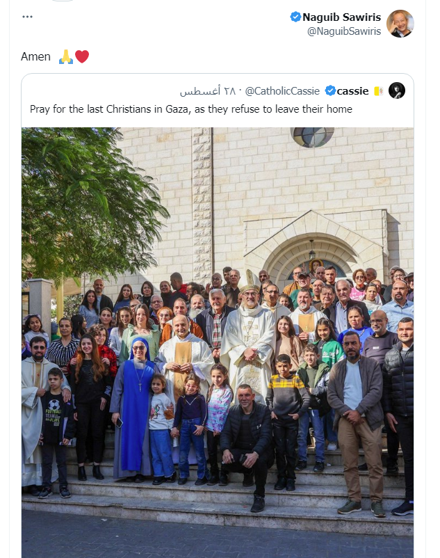 وعلق نجيب ساويرس على مطالبات النشطاء بالدعاء لرجال الدين المتمسكين بوطنهم في غزة ورفضهم مغادرته، قائلًا: "آمين"، وأرفق ذلك برمز يد ممدودة للدعاء.