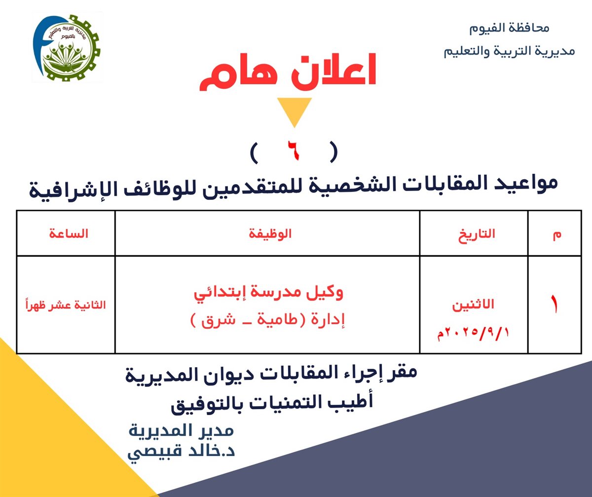 أعلنت مديرية التربية والتعليم بمحافظة الفيوم، أن لجنة اختيار من يشغلون الوظائف القيادية والإشرافية بالإدارات التعليمية والمديرية، تعقد جلسة المقابلات الشخصية للمتقدمين لوظائف وكيل مدرسة ابتدائي، بإدارتي شرق الفيوم، وطامية التعليمية، يوم الاثنين المقبل، أول سبتمبر.