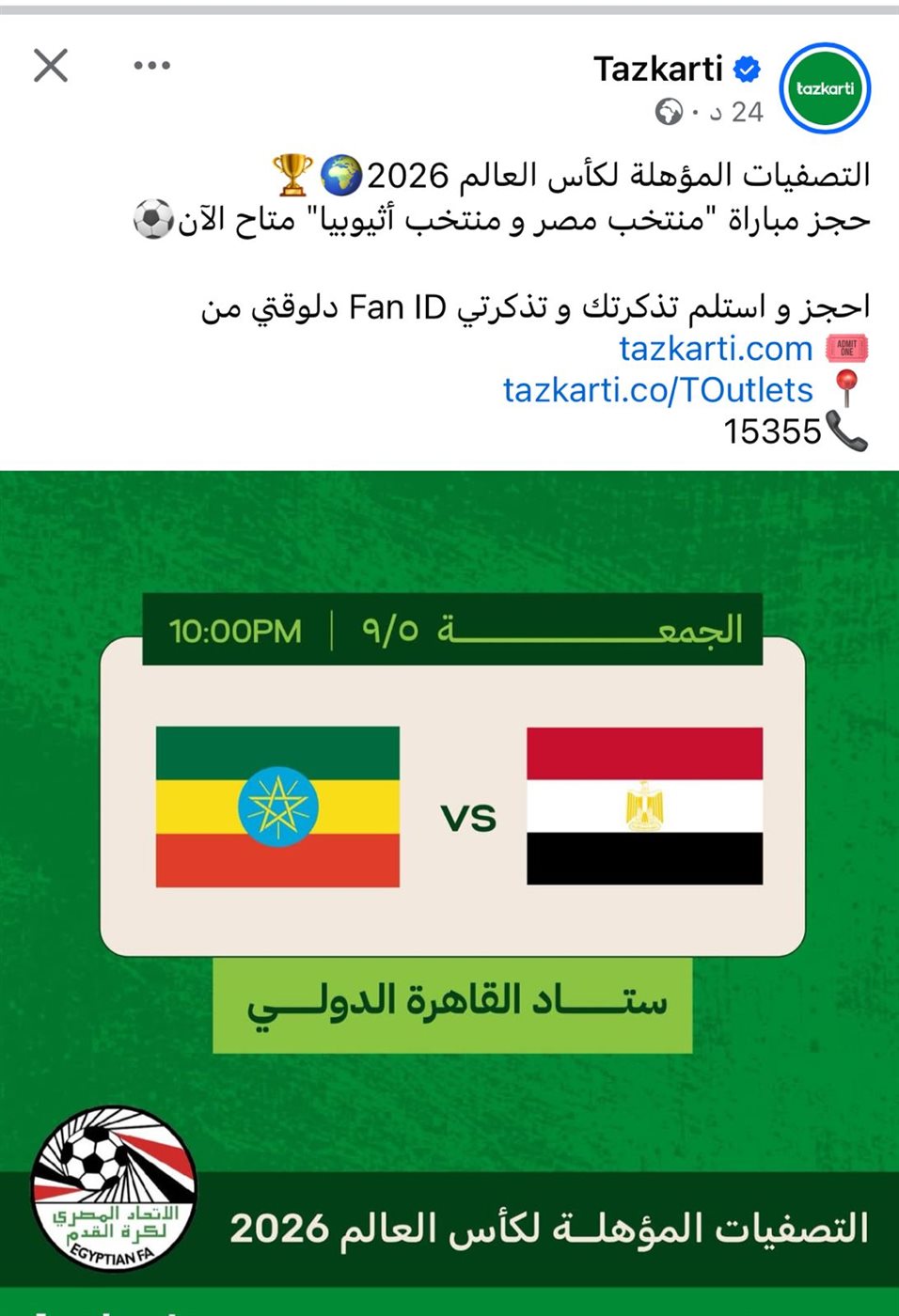 طرحت شركة تذكرتي تذاكر مباراة منتخب مصر وإثيوبيا المقرر لها ٥ سبتمبر الجاري باستاد القاهرة في الجولة السابعة من التصفيات الأفريقية المؤهلة لنهائيات كأس العالم ٢٠٢٦.