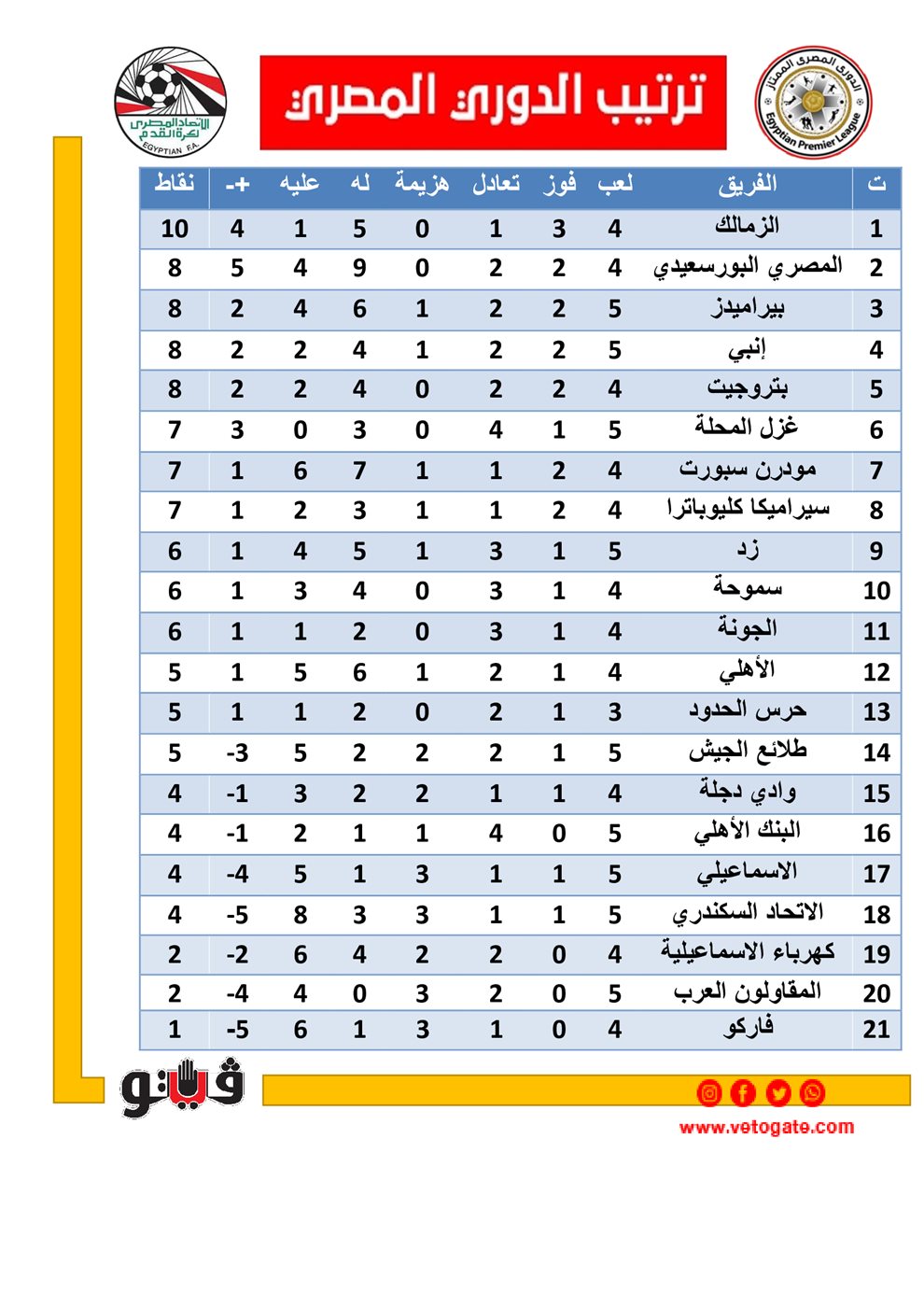 ترتيب الدوري المصري، تلقي النادي الأهلي الخسارة من بيراميدز 2-0 في قمة الجولة الخامسة من بطولة الدوري المصري الممتاز، فيما حقق غزل المحلة انتصاره الأول بالدوري أمام الاسماعيلي 3-0.