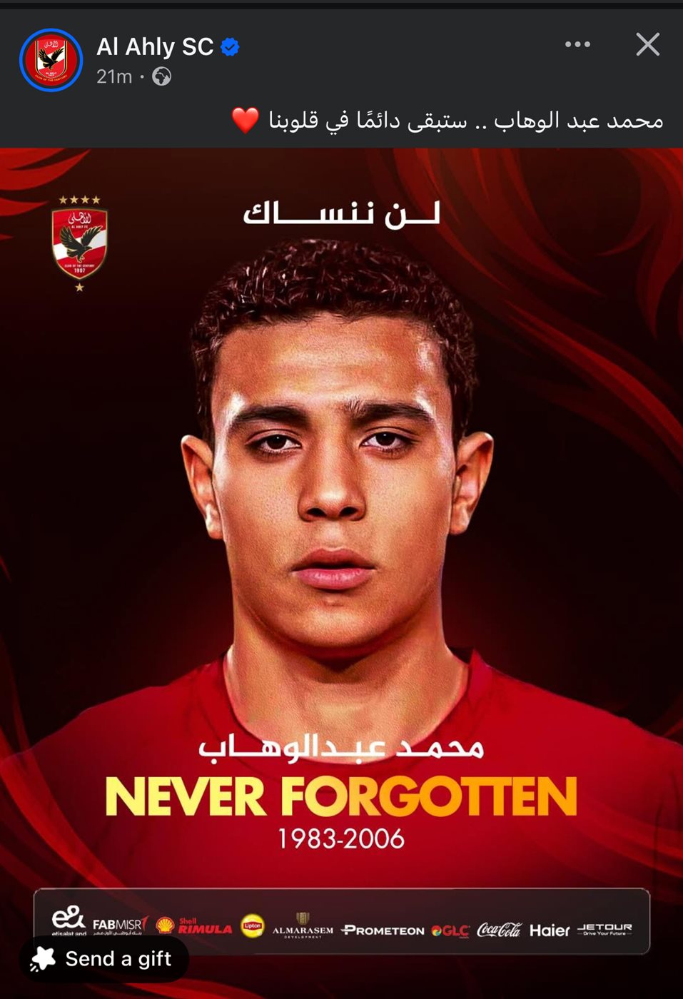 ونشر حساب الأهلي صورة للراحل محمد عبد الوهاب وعلق" محمد عبد الوهاب.. ستبقى دائمًا في قلوبنا ".