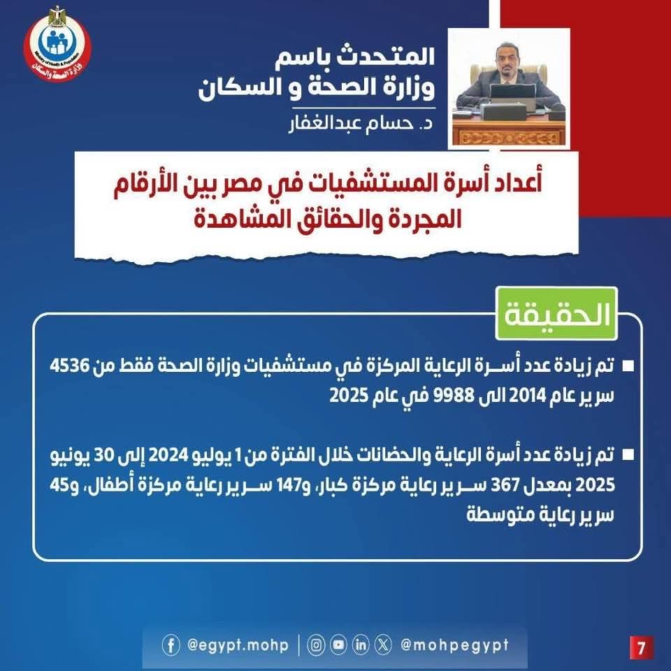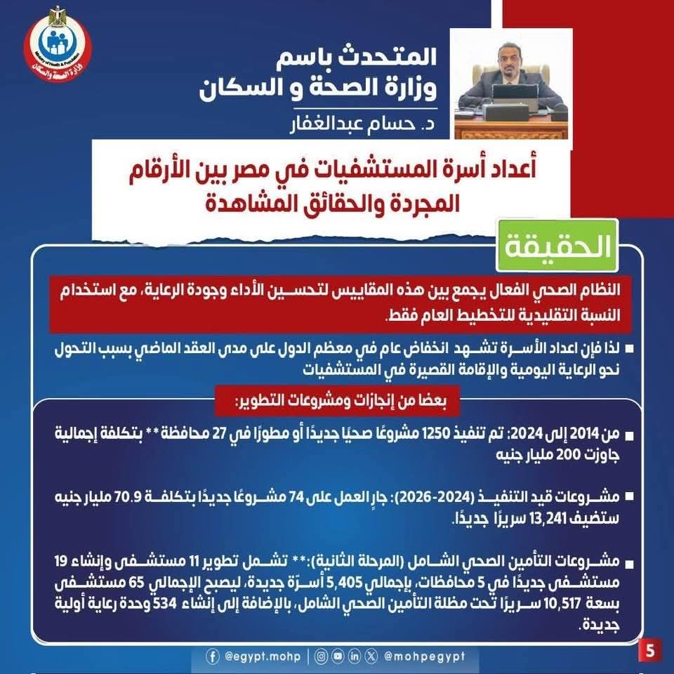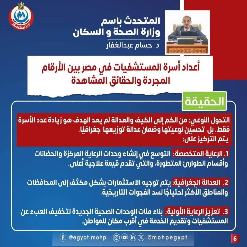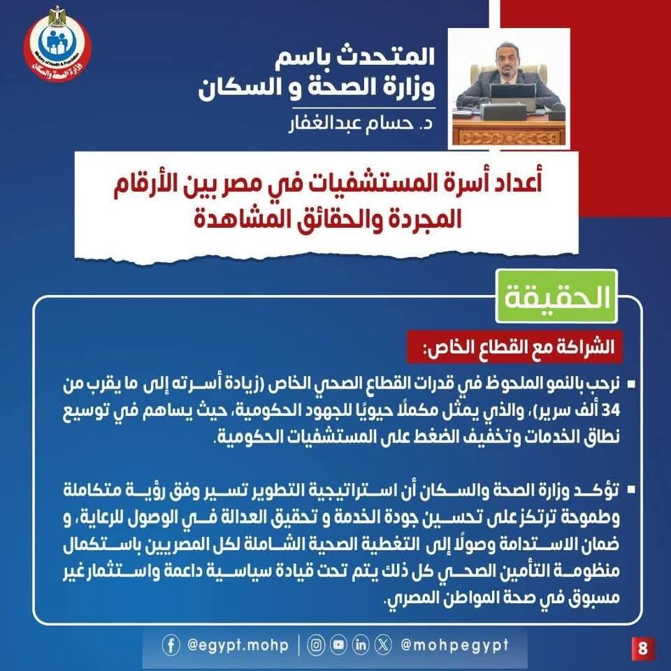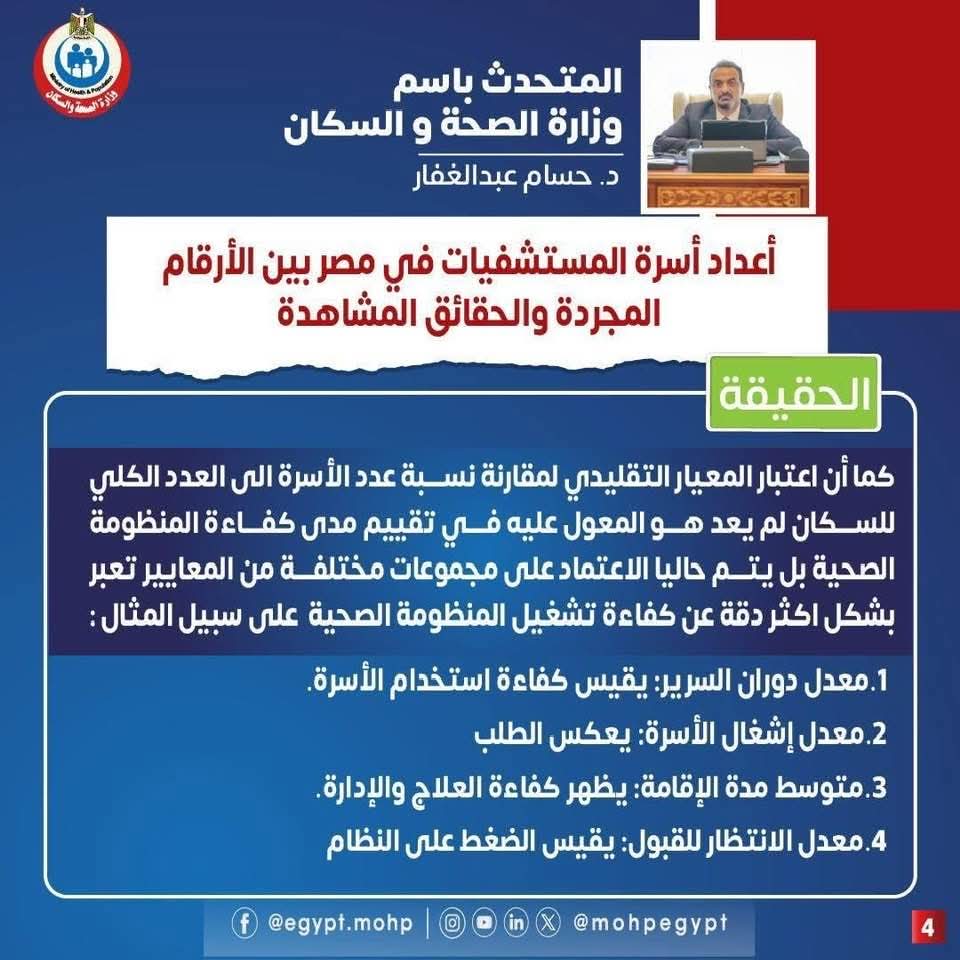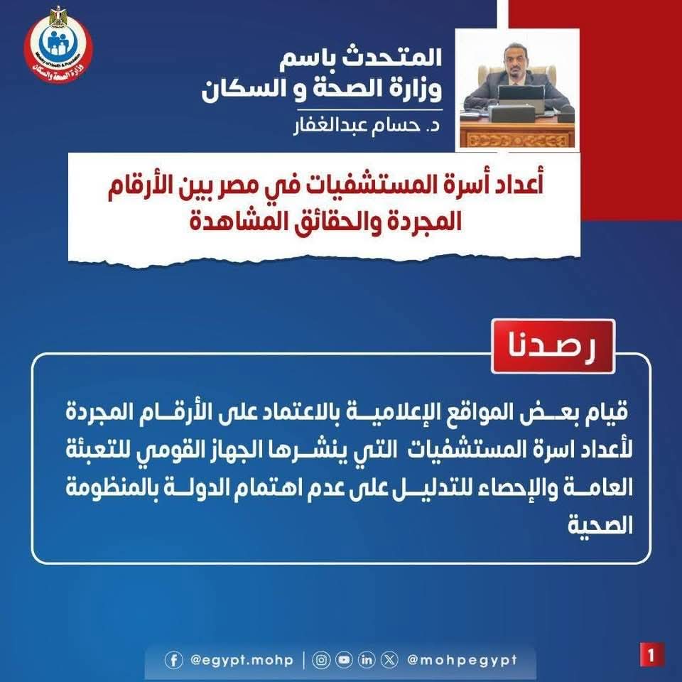 وأكد المتحدث الرسمي باسم وزارة الصحة والسكان، أن قراءة أعداد أسرة المستشفيات لا تقتصر على الأرقام المجردة، بل يجب النظر إليها في إطار التطوير الشامل الذي يشهده القطاع الصحي.