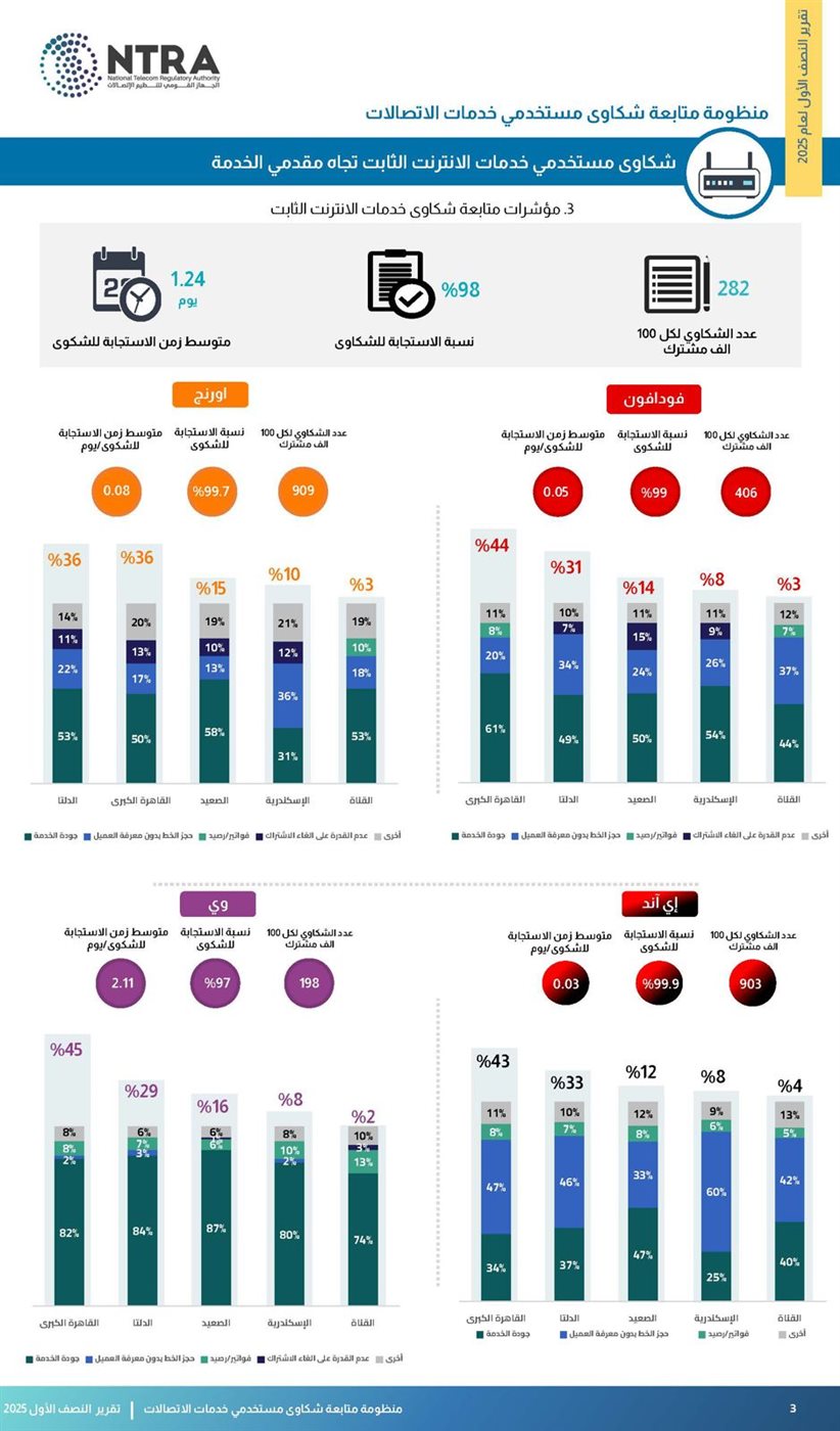 بلغ معدل شكاوى الإنترنت الثابت 282 شكوى لكل ١٠٠ ألف مشترك، وبلغت نسبة الاستجابة للشكاوى بعد التصعيد للجهاز 98%، كما بلغ متوسط وقت الاستجابة للشكوى 1.24 يوم.