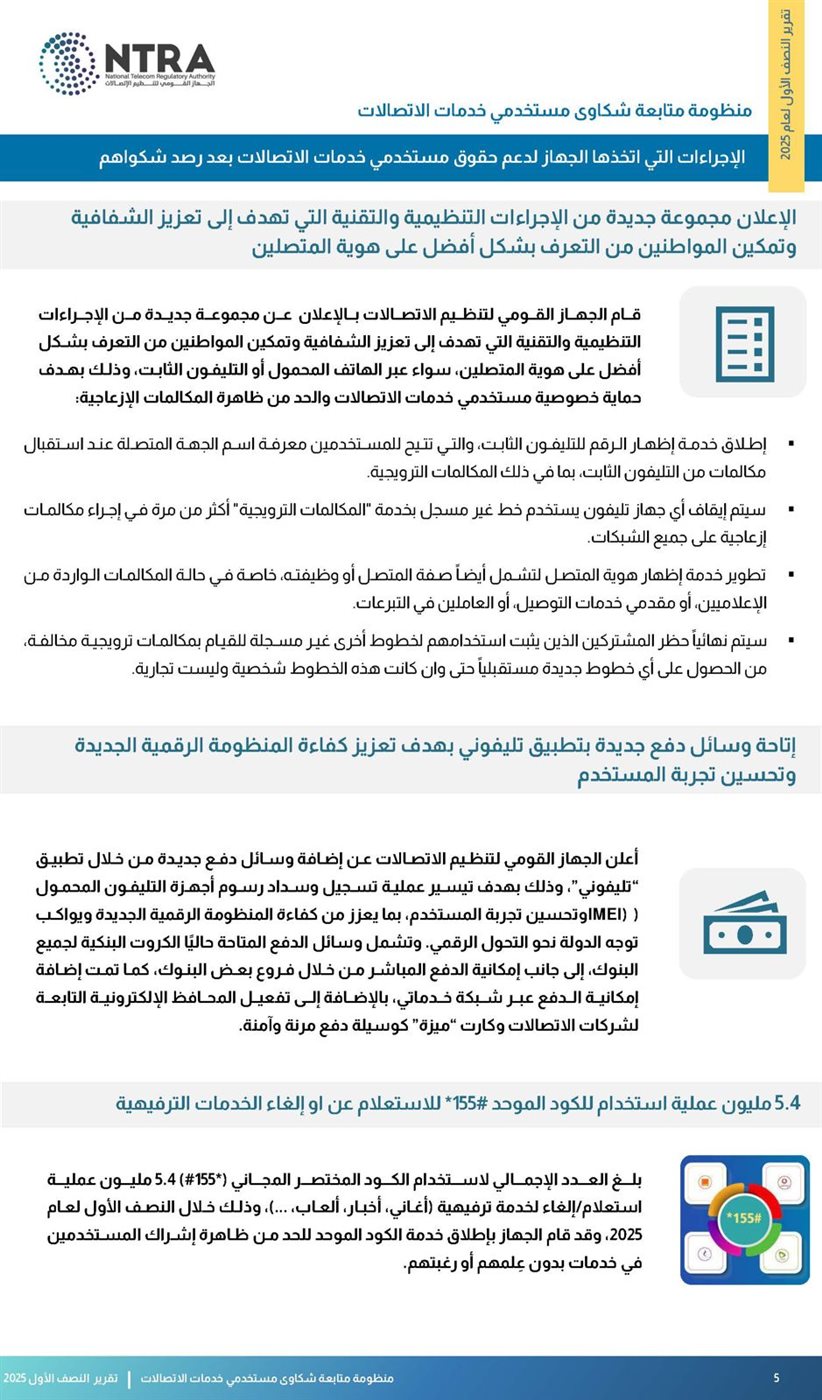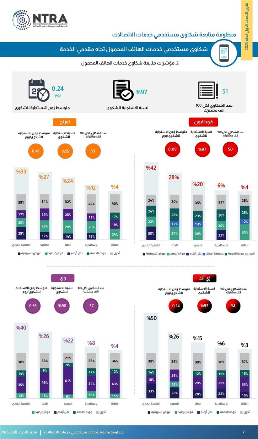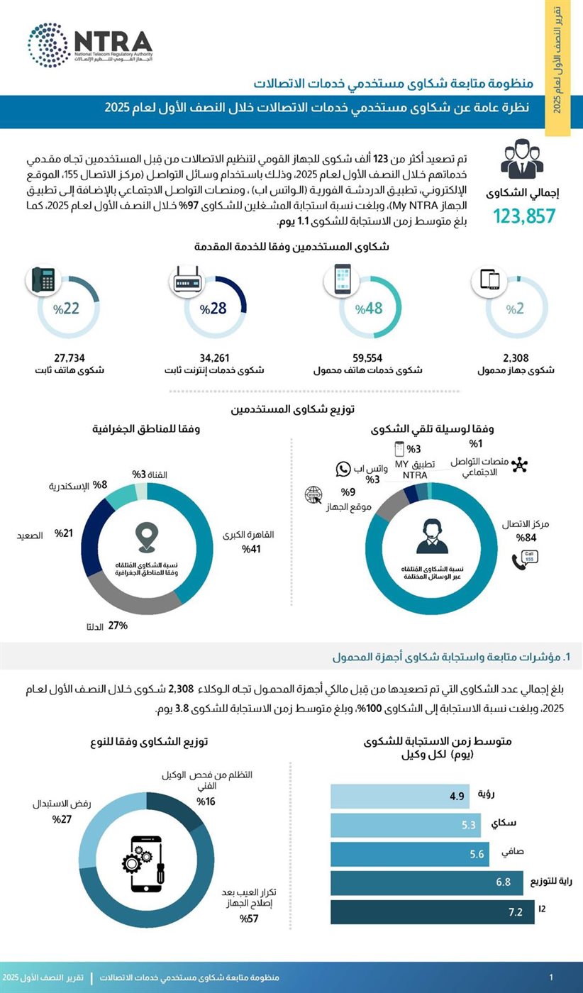 يأتي ذلك في إطار حرص الجهاز القومي لتنظيم الاتصالات على دعم حقوق المستخدمين وضمان تقديم خدمات اتصالات ذات جودة في السوق المصري، حيث يتلقى الجهاز القومي لتنظيم الاتصالات شكاوى مستخدمي خدمات الاتصالات تجاه مقدمي خدماتهم، عن طريق مركز الاتصال (١٥٥)، بالإضافة إلى وسائل اتصال إلكترونية قام الجهاز بإضافتها لتيسير التواصل مع المستخدمين وإتاحة قنوات غير تقليدية لتلقي الشكاوى مثل تطبيق المحمول الخاص بالجهاز My NTRA، وموقع الجهاز على الإنترنت، والبريد الإلكتروني، وتطبيق الدردشة الفورية (الواتس آب)، مما أسفر عن تلقي 123857 شكوى خلال النصف الأول من عام 2025، وبلغت نسبة استجابة المشغلين للشكاوى خلال العام 97٪، كما بلغ متوسط زمن الاستجابة للشكوى 1.1 يوم.