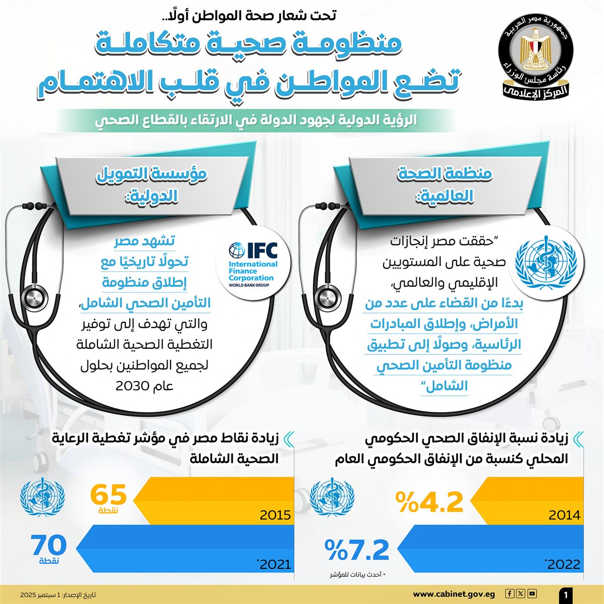 وتجسد هذه الجهود التزام الدولة بتحقيق التغطية الصحية الشاملة لجميع المواطنين، من خلال بناء نظام صحي متكامل ومستدام يقوم على تحسين جودة الخدمات المقدمة، وضمان العدالة في الحصول على الرعاية، والاستفادة من أحدث التقنيات الطبية، كما تعكس هذه الخطوات إدراك الدولة لأهمية القطاع الصحي كركيزة أساسية للتنمية الشاملة، وعنصرًا أساسيًا في تحسين جودة الحياة للمواطنين.