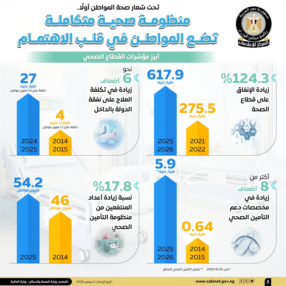 وفيما يتعلق بأبرز مؤشرات القطاع الصحي، أشارت الإنفوجرافات إلى زيادة الإنفاق على قطاع الصحة بنسبة 124.3%، ليصل إلى 617.9 مليار جنيه عام 2025/2026، مقابل 275.5 مليار جنيه عام 2021/2022.
