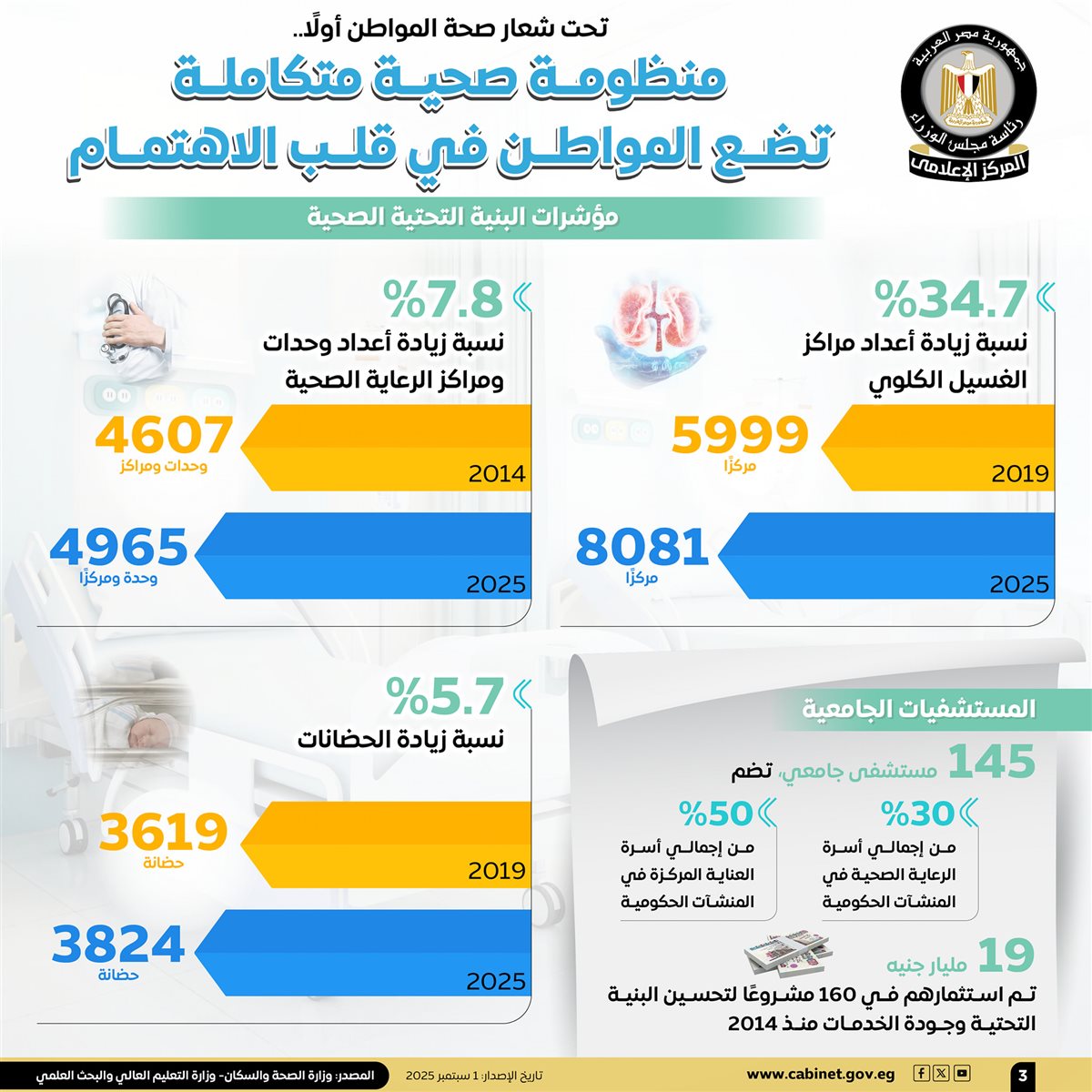 وعلى صعيد مؤشرات البنية التحتية الصحية، أظهرت الإنفوجرافات زيادة أعداد مراكز الغسيل الكلوي بنسبة 34.7%، لتصل إلى 8081 مركزًا عام 2025، مقارنة بـ 5999 مركزًا عام 2019، كما زادت أعداد وحدات ومراكز الرعاية الصحية بنسبة 7.8%، لتصل إلى 4965 وحدة ومركز عام 2025، مقابل 4607 وحدات ومراكز عام 2014.