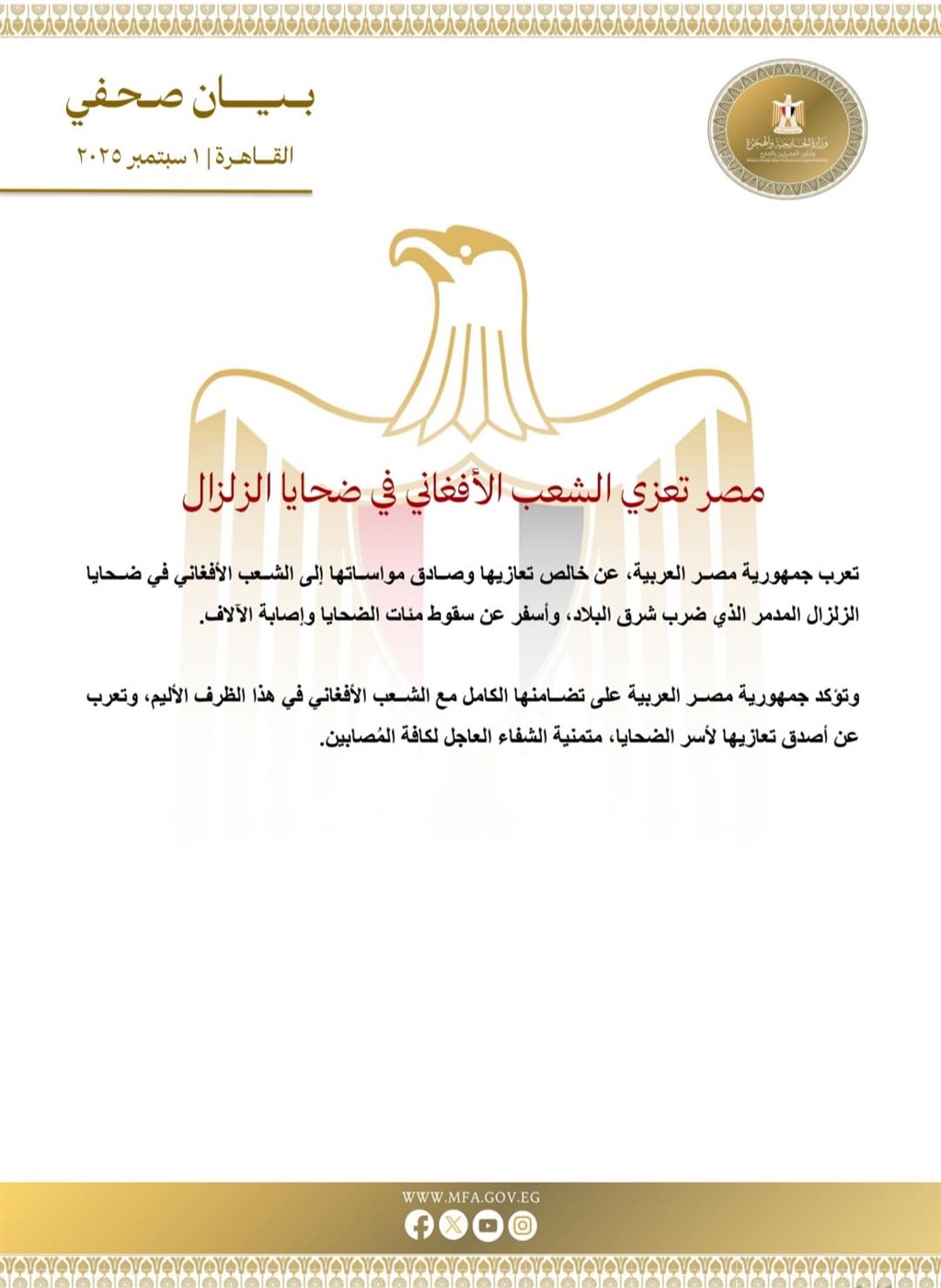 أعربت جمهورية مصر العربية، عن خالص تعازيها وصادق مواساتها إلى الشعب الأفغاني في ضحايا الزلزال المدمر الذي ضرب شرق البلاد، وأسفر عن سقوط مئات الضحايا وإصابة الآلاف.