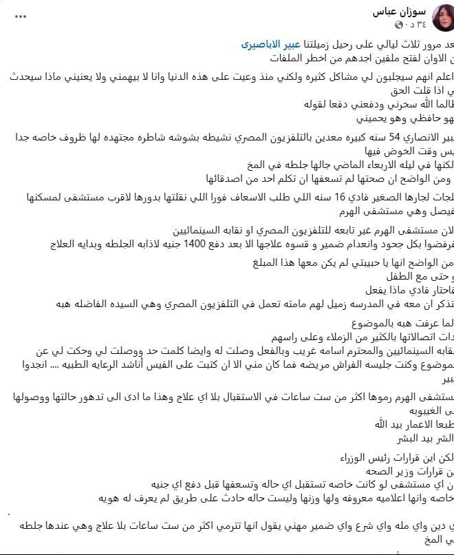 وقالت خلال منشور لها علي موقع التواصل الاجتماعي فيس بوك: إن عبير الأباصيري دخلت المستشفى في حالة حرجة، إلا أنها تركت في قسم لاستقبال لساعات دون الحصول على الرعاية الطبية اللازمة، بزعم ضرورة دفع مبلغ مالي قدره 1400 جنيه قبل بدء العلاج، وهو ما أدى إلى تدهور حالتها الصحية ودخولها في غيبوبة انتهت بوفاتها.