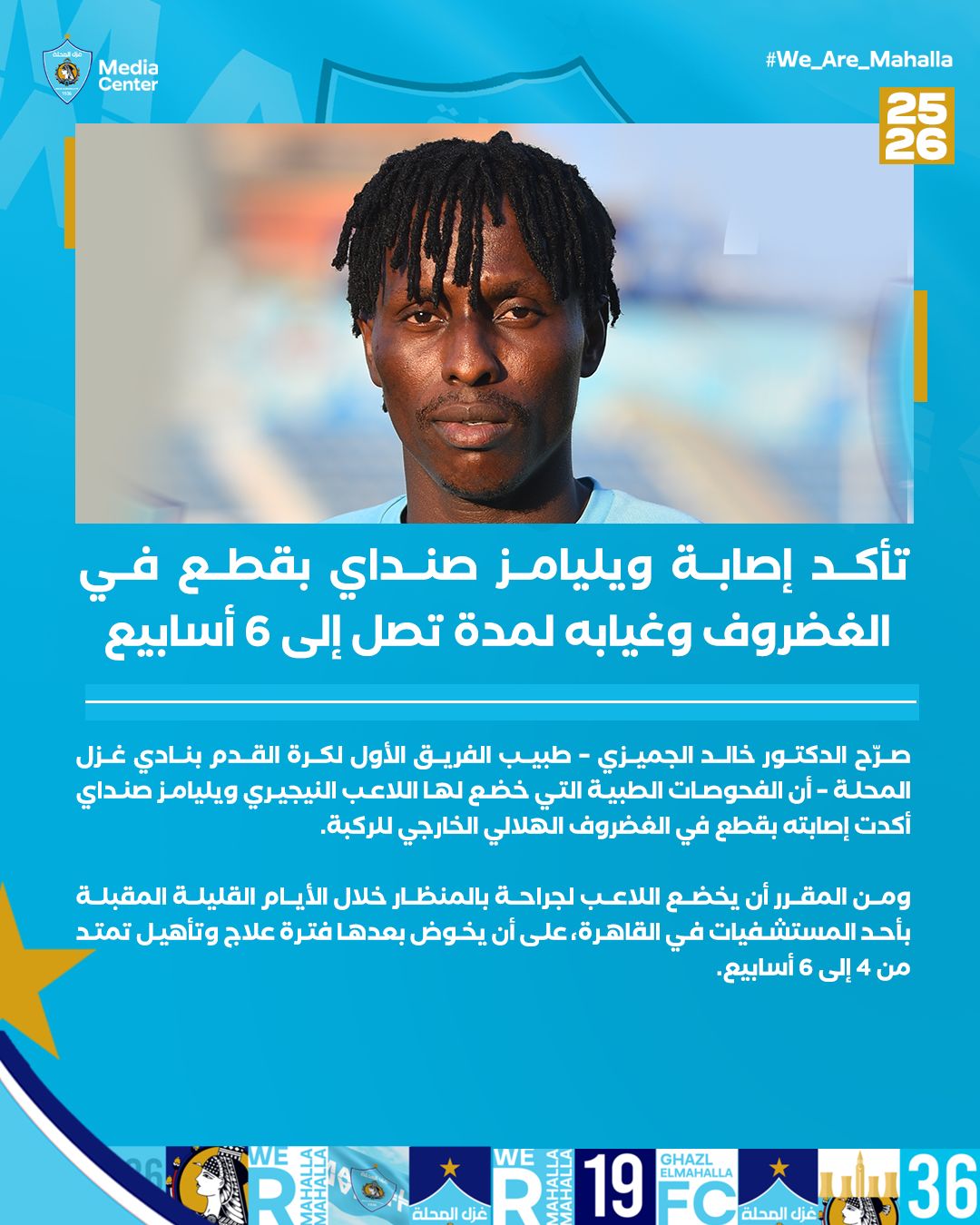 إصابة ويليامز صنداي لاعب غزل المحلة بقطع في الغضروف