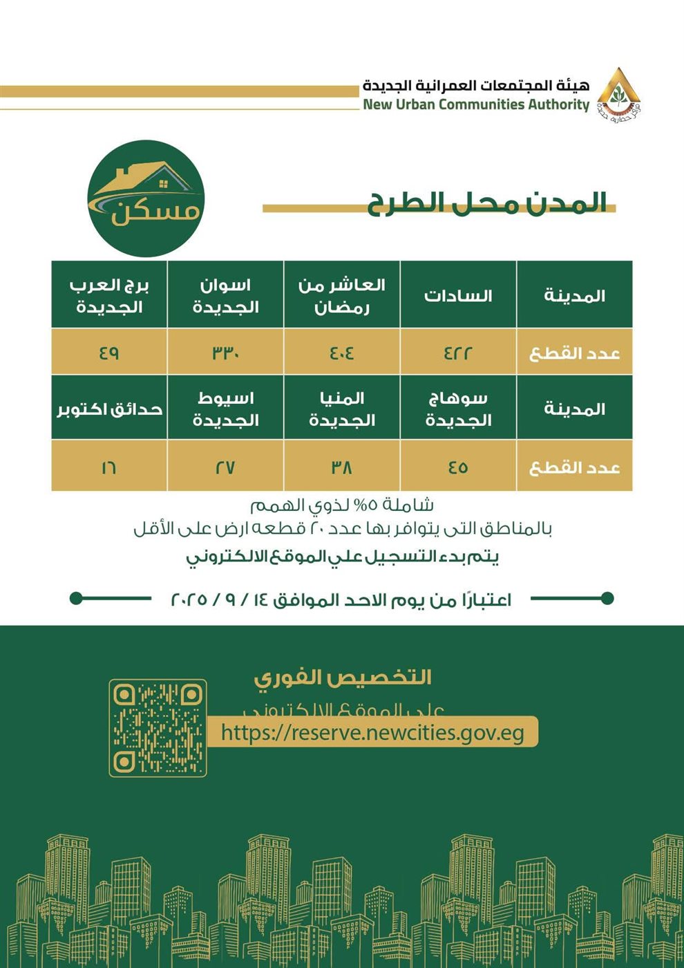 وأوضحت الوزارة أن الأراضي المطروحة مقسمة كالآتي: ۱۳۳۱ قطعة أرض إسكان متوسط بـ ۸ مدن جديدة، و۸۲۸ قطعة أرض إسكان مميز بـ 9 مدن جديدة، و١٧٤ قطعة أرض إسكان أكثر تميزا بـ 3 مدن جديدة، كما تضمن الطرح توفير ۱۱۲ قطعة أرض سكنية ضمن الأراضي المطروحة لذوي الهمم.