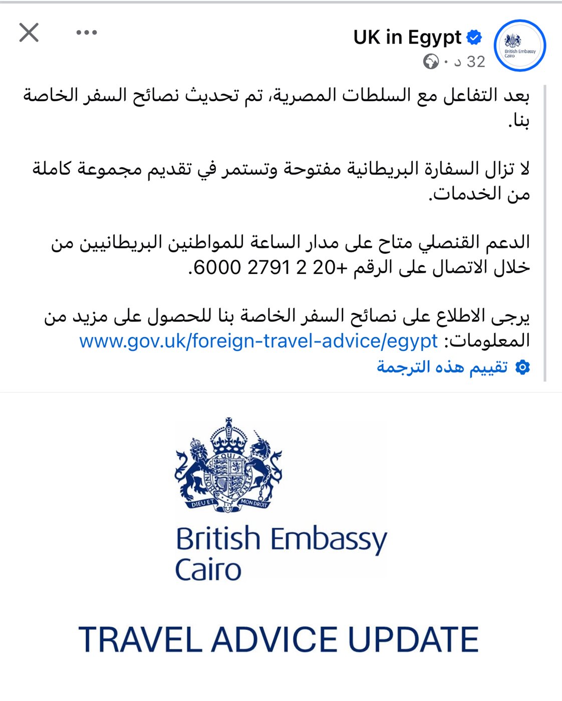 وقالت السفارة إن الدعم القنصلي يتوفر على مدار الساعة طوال أيام الأسبوع للمواطنين البريطانيين عن طريق الاتصال على الرقم +20 2 2791 6000.