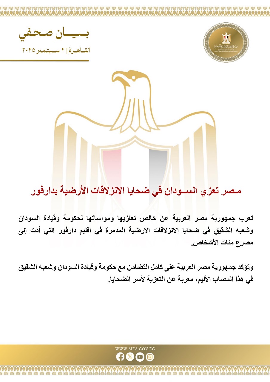 أعربت جمهورية مصر العربية عن خالص تعازيها ومواساتها لحكومة وقيادة السودان وشعبه الشقيق في ضحايا الانزلاقات الأرضية المدمرة في إقليم دارفور التي أدت إلى مصرع مئات الأشخاص.