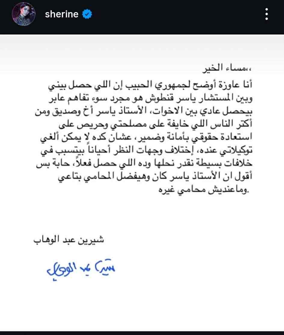 وقالت شيرين في بيان جديد لها: اللي حصل بيني وبين المستشار ياسر قنطوش مجرد سوء تفاهم بيحصل بين الأخوات.. ياسر أخ وصديق، ومن أكتر الناس الحريصة على مصلحتي واستعادة حقوقي بأمانة وضمير، وبالتالي لا يمكن ألغي توكيلي.
