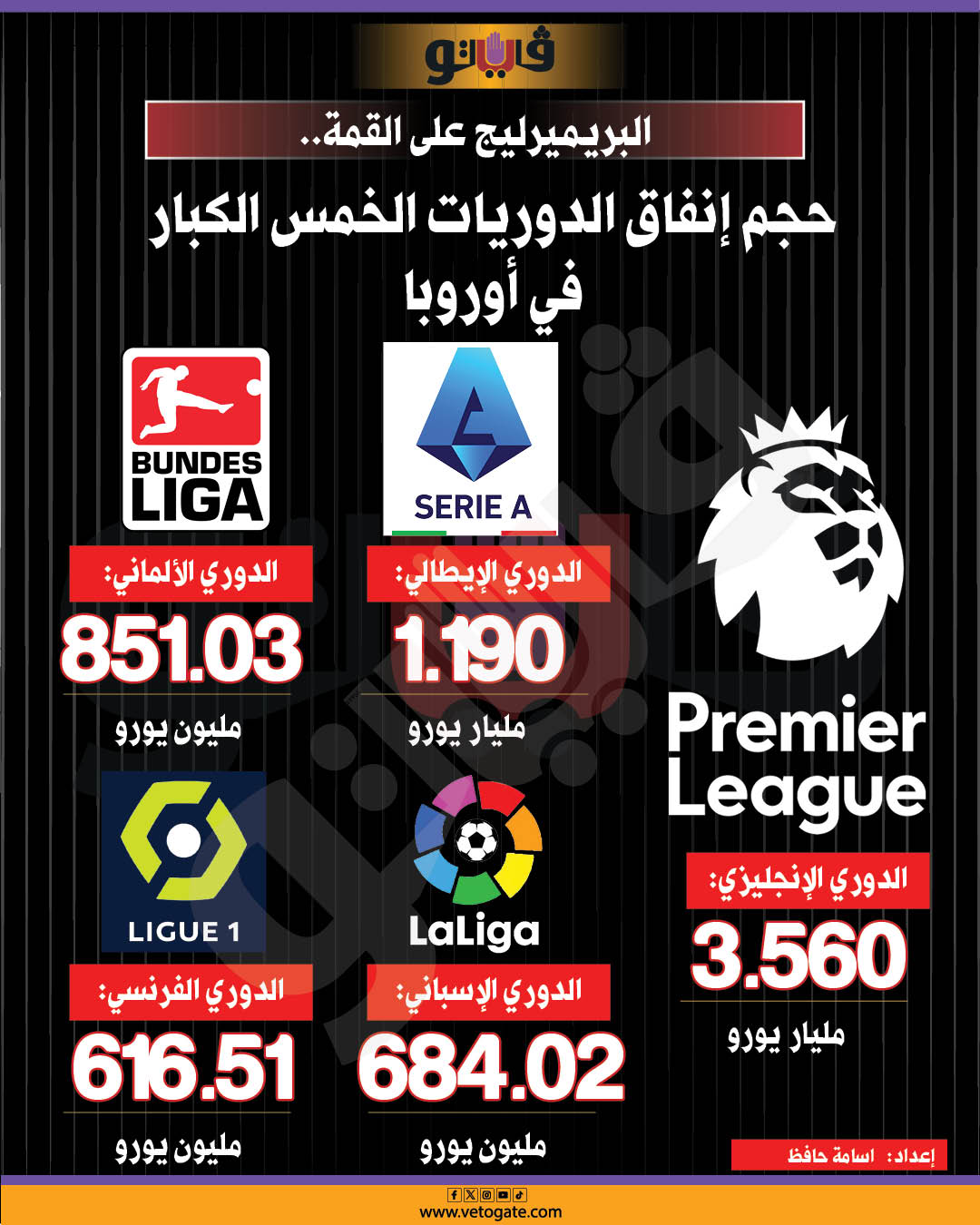 البريميرليج على القمة.. حجم إنفاق الدوريات الخمس الكبار في أوروبا (إنفوجراف)