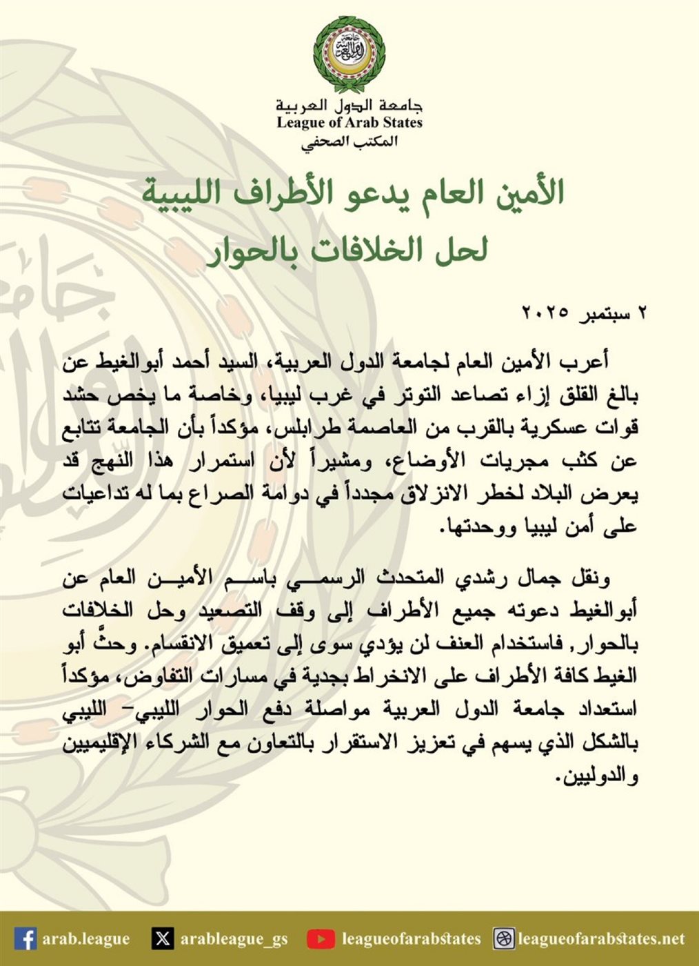 أعرب الأمين العام لجامعة الدول العربية، أحمد أبو الغيط عن بالغ القلق إزاء تصاعد التوتر في غرب ليبيا، وخاصة ما يخص حشد قوات عسكرية بالقرب من العاصمة طرابلس، مؤكدًا بأن الجامعة تتابع عن كثب مجريات الأوضاع، ومشيرًا لأن استمرار هذا النهج قد يعرض البلاد لخطر الانزلاق مجددًا في دوامة الصراع بما له تداعيات على أمن ليبيا ووحدتها.