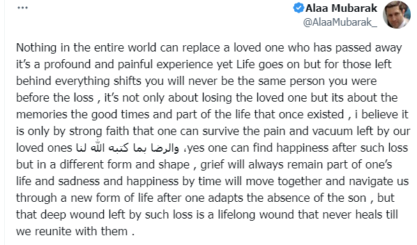 وعن تجربة فقد نجله ووالده، قال علاء مبارك في رسالة مؤلمة نشرها عبر حسابه بمنصة "أكس": "لا شيء في العالم بأسره يمكن أن يحل محل شخص عزيز قد رحل إنها تجربة عميقة ومؤلمة ومع ذلك تستمر الحياة، ولكن بالنسبة لأولئك الذين تركوا وراءهم كل شيء يتغير لن تكون أبدًا نفس الشخص الذي كنت عليه قبل الخسارة".